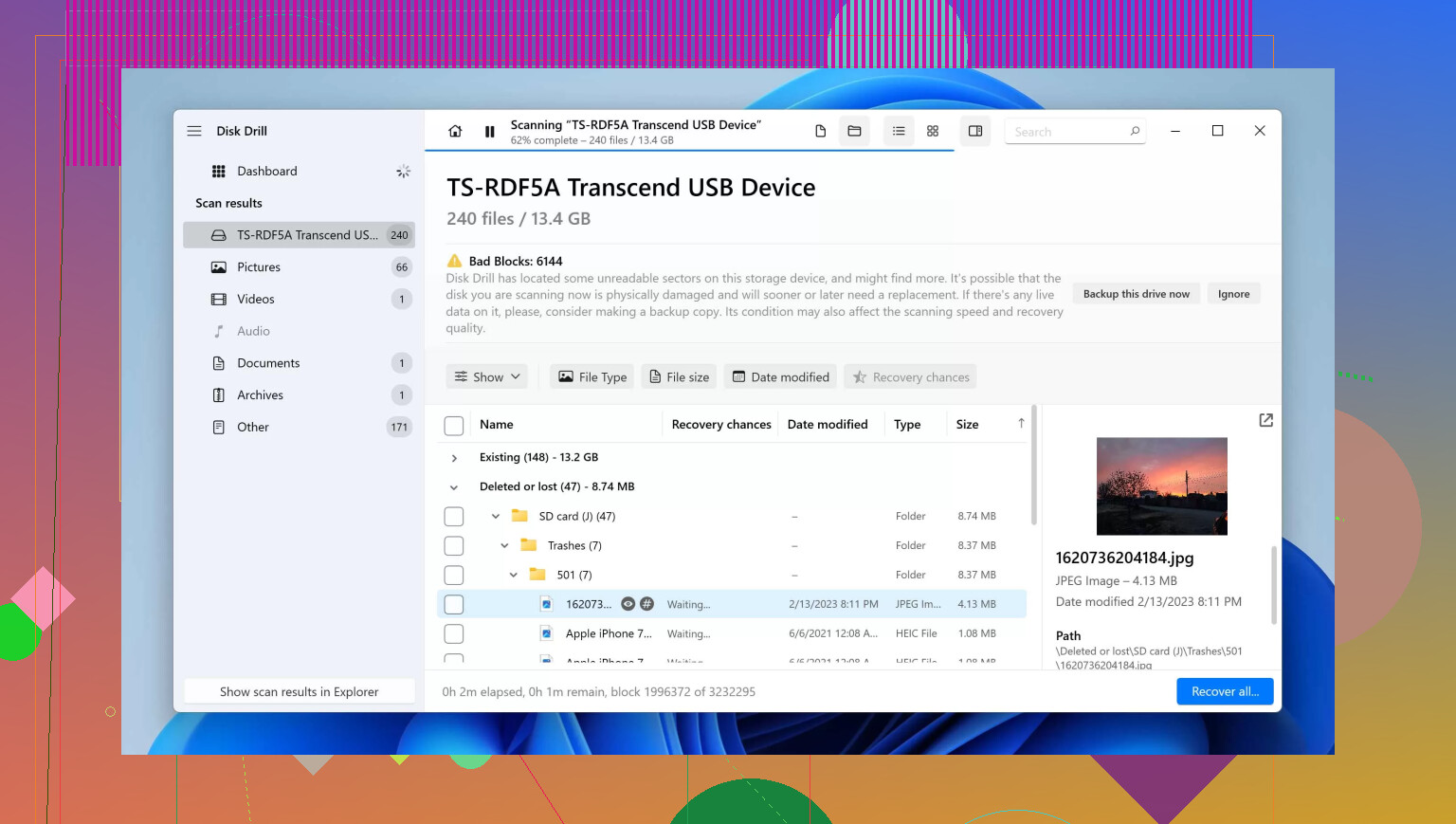 - Use a recovery app with good photo support. Disk Drill is one of the better picks for SD card recovery because it handles deleted and formatted media well, and it previews found files before recovery.