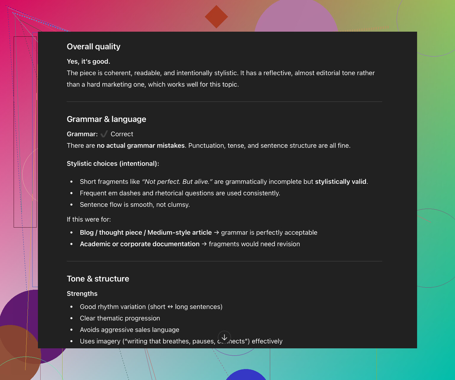 제 추측으로는 이 반쯤 포멀한 톤이 디텍터 패턴을 피하면서도, 사람 눈에는 자연스럽게 느껴지는 데 도움을 주는 것 같습니다.
