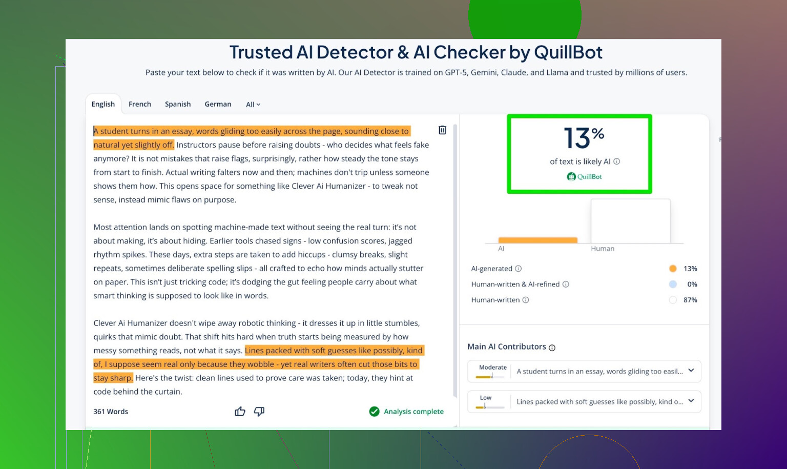 - QuillBot detector: 13% AI