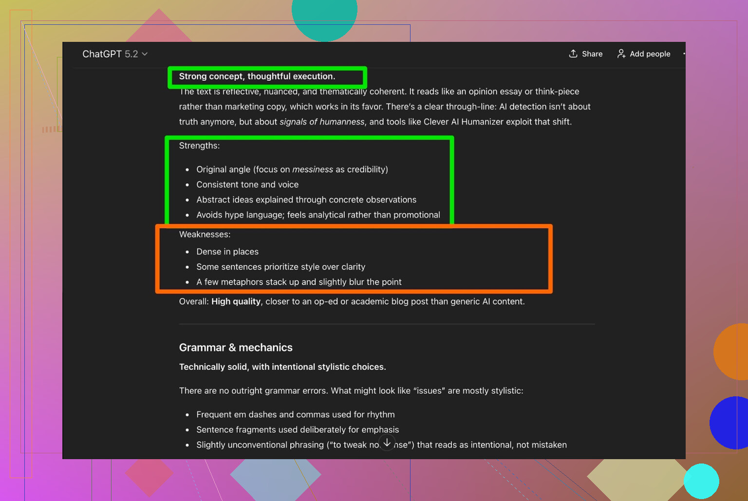 그래서 Clever AI Humanizer가 뱉은 텍스트를 다시 ChatGPT 5.2에 넣고, 아래를 물었습니다: