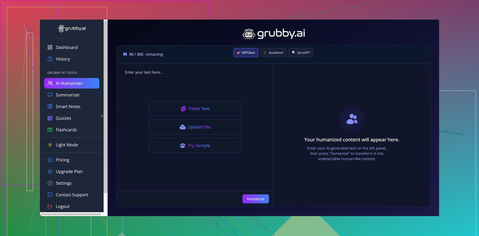 Grubby AI looks like it was built for one purpose: poke at specific AI detectors and try to slip past them. It has modes named after GPTZero, ZeroGPT, and Turnitin, which sounds smart on paper. I spent a chunk of time feeding it different texts and checking the outputs against the same detectors it claims to target.