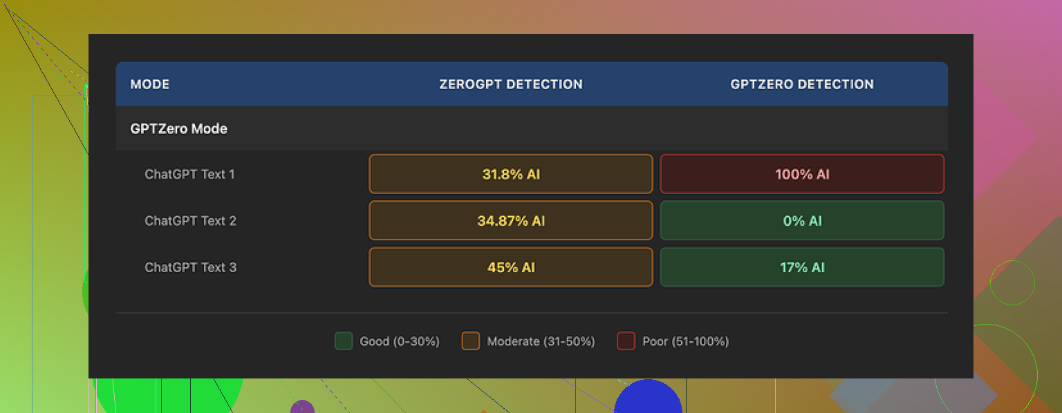 • Detection scores tended to be more consistent. Not perfect, but I did not hit the “0 percent AI” on one run and “100 percent AI” on the next with the same mode and similar text.