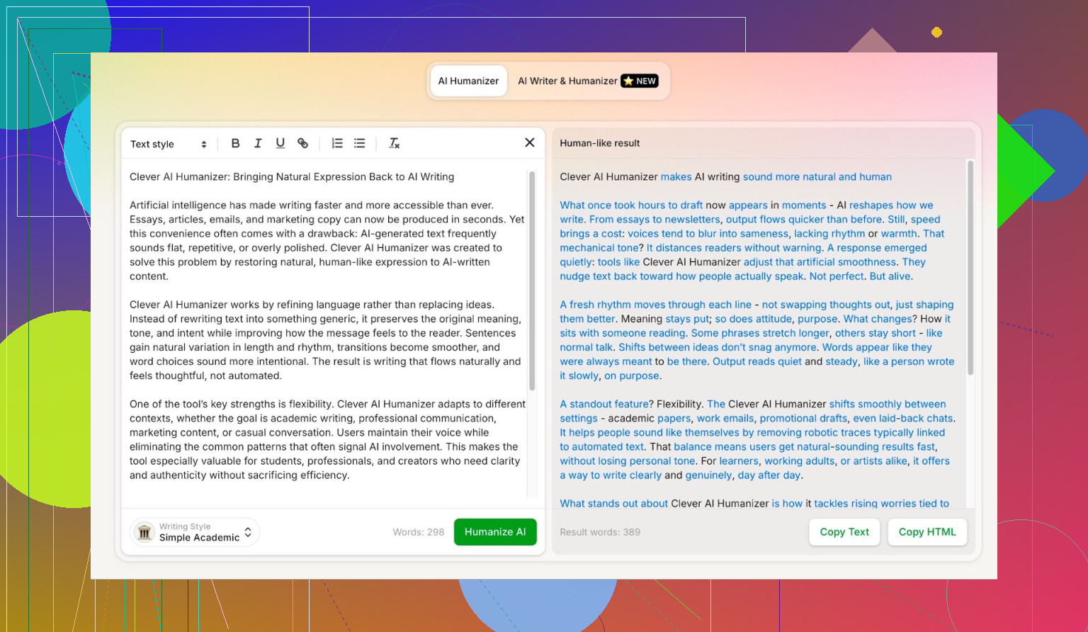 - Output fra Clever AI Humanizer i Simple Academic‑modus: