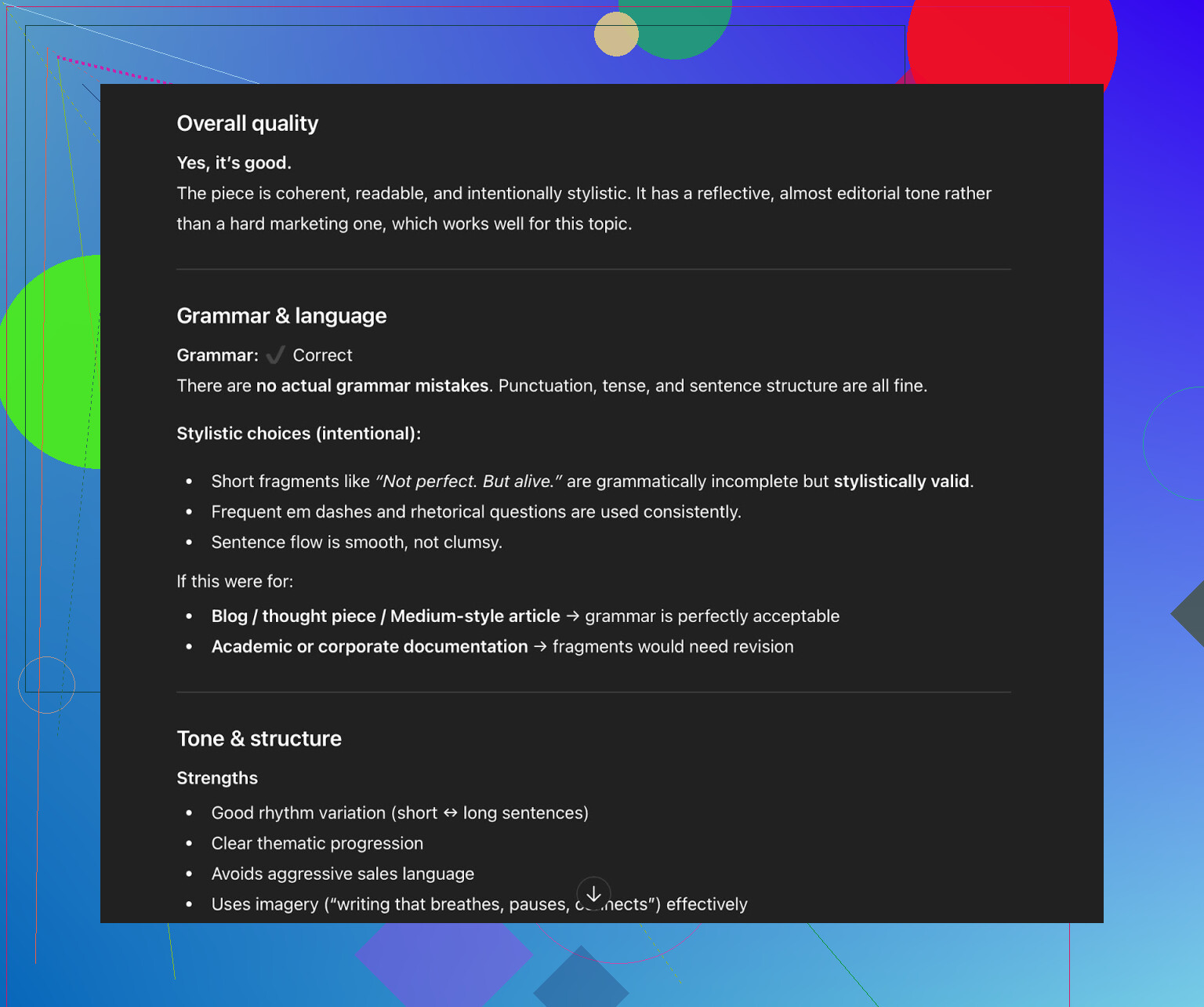 Jeg kjørte dette andre stykket (fra AI Writer) tilbake gjennom ChatGPT 5.2 også.
