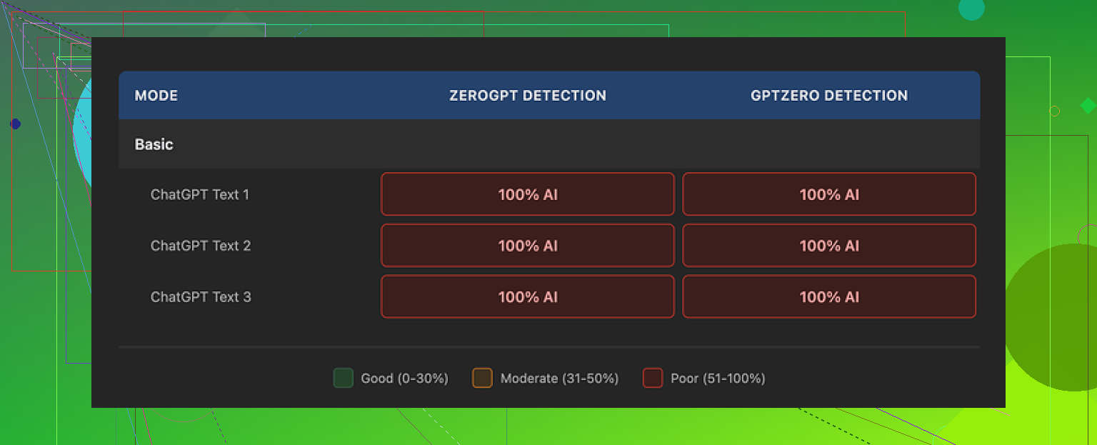• Detection: 0/10 for bypassing GPTZero and ZeroGPT.