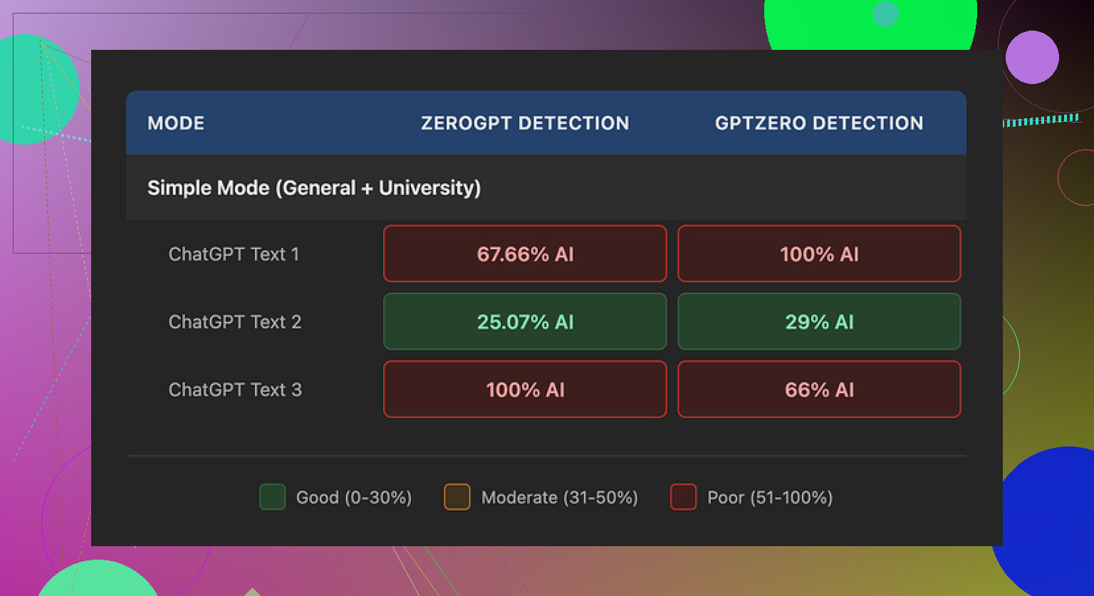 - Behavior is inconsistent: sometimes scores are decent, sometimes they spike and scream “AI.”